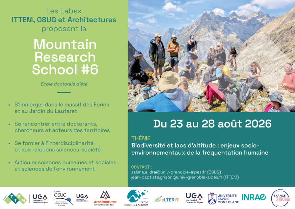 The 6th Mountain Research School, a doctoral summer school at the heart of mountain territories, will be organized from August 23 to 28, 2026 by Labex ITTEM, OSUG and Architectures. It will take place in the Écrins massif around the Jardin du Lautaret.